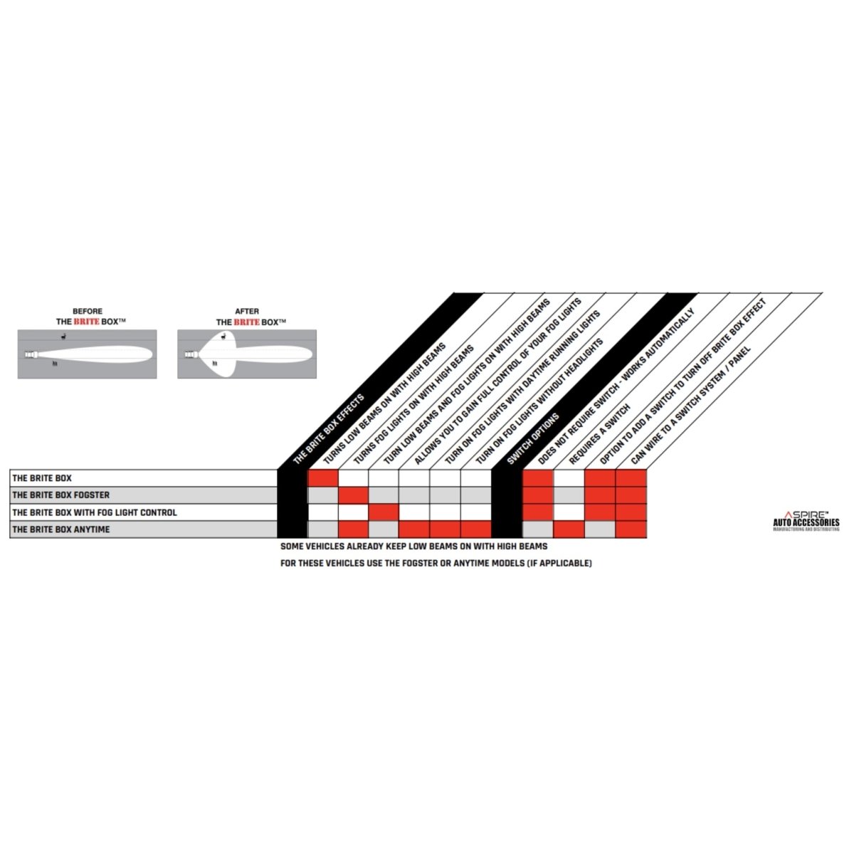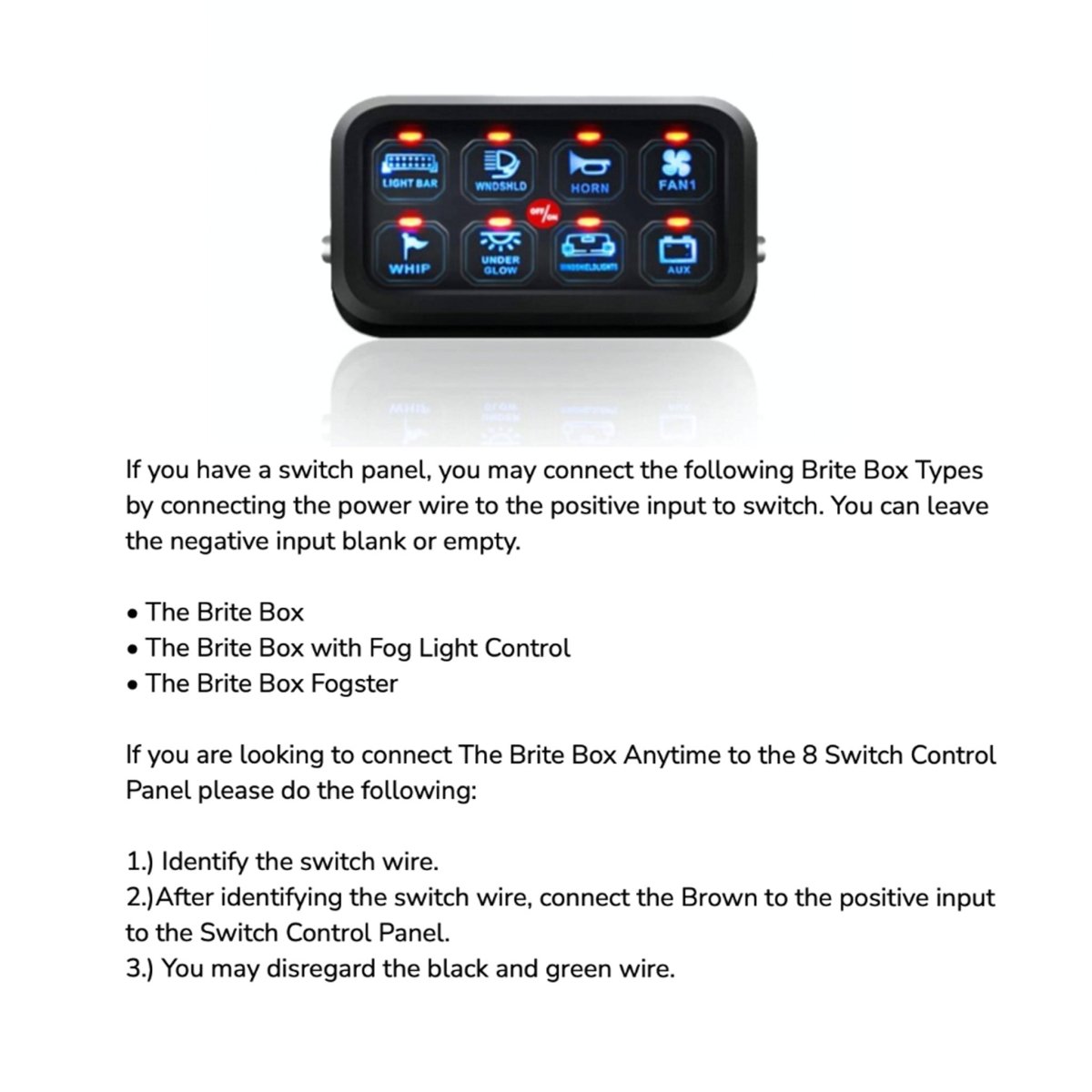 For general product questions or wiring The Brite Box Anytime with an 8 switch control panel or other similar systems please contact the manufacturer (Aspire Auto Accessories).
